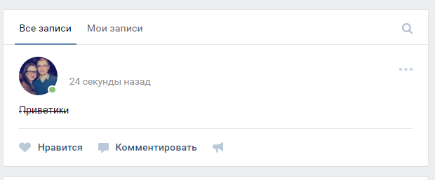 Кстати, сообщения с перечеркнутыми буквами можно оставлять не только в постах на собственной стенке, но и в предложенных записях или на открытых стенах в сообществах, в комментариях к записям, фотографиям или видео, а также в личной переписке через диалоги ВКонтакте.