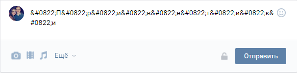 К примеру, если мы задумали написать на своей стене зачеркнутым текстом фразу «Приветики», то нужная нам комбинация будет выглядеть так: