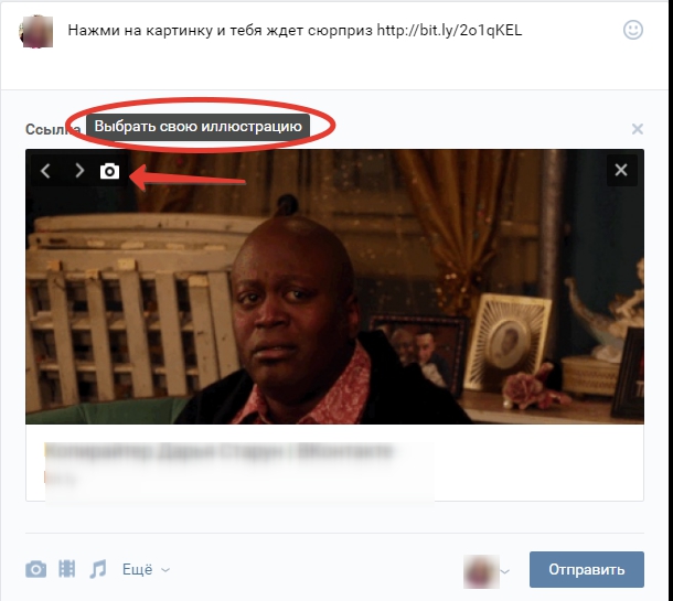 Система автоматически создаст окно ссылки в посте. В нем же есть маленький ярлык фотоаппарата, позволяющий заменить стандартную фотография ссылки на выбранную вами.