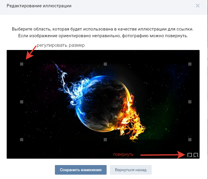 В следующем окне можно регулировать размер картинки, выбрать нужную область или повернуть изображение, если вы загрузили его в неправильной ориентации. Закончив с этим, нужно будет нажать на «Сохранить изменения». После ссылка автоматически превратится в выбранное изображение и останется только удалить текст ссылки, и опубликовать запись.