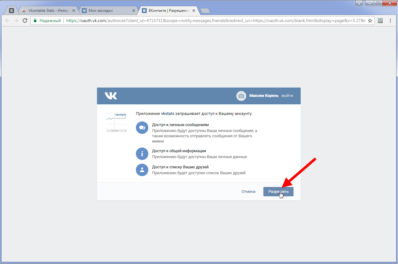 4. Выполняем авторизацию в социальной сети Вконтакте.