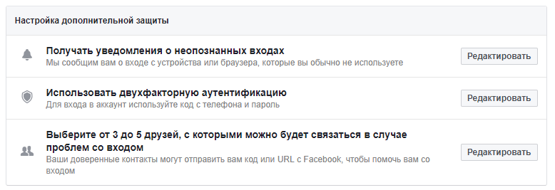 Вы можете выбрать двухфакторную аутентификацию или же указать несколько друзей, которые впоследствии помогут Вам вернуть доступ к своему аккаунту. Кроме того, можно включить уведомления обо всех неопознанных входах.