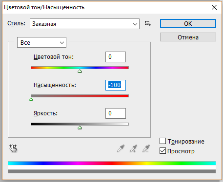Следующим шагом будет обесцвечивание картинки. Это можно сделать несколькими способами. Во-первых, можно нажать Ctrl+U. Переведите бегунок с показателем «насыщенность» влево до самого конца.