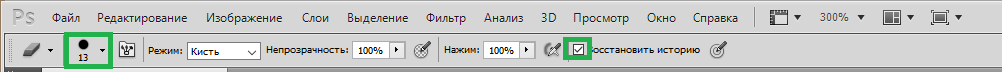 В его параметрах настройте размер и поставьте галочку возле опции «Восстановить историю». Также можно поработать с параметрами прозрачности и интенсивности.