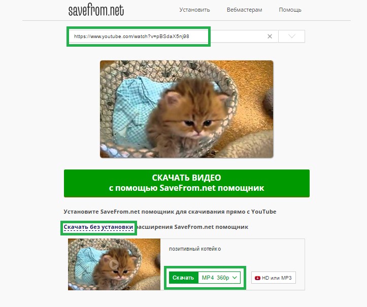 Далее необходимо выбрать опцию «Скачать без установки». Определите необходимый формат и начинайте загрузку. Вскоре видео появится на Вашем компьютере. Безусловно, существуют и другие подобные онлайн-сервисы. Например, большой популярностью пользуются сайты KeepVid.com и Videograbby.com. Механика их использования близка к описанному.
